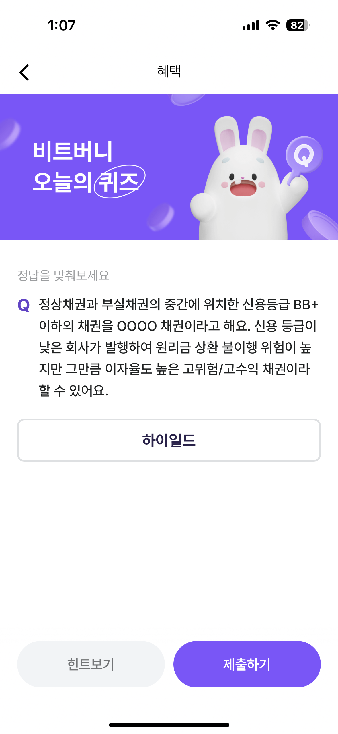 정상채권과 부실채권의 중간에 위치한 신용등급 BB+ 이하의 채권을 0000 채권이라고 해요.